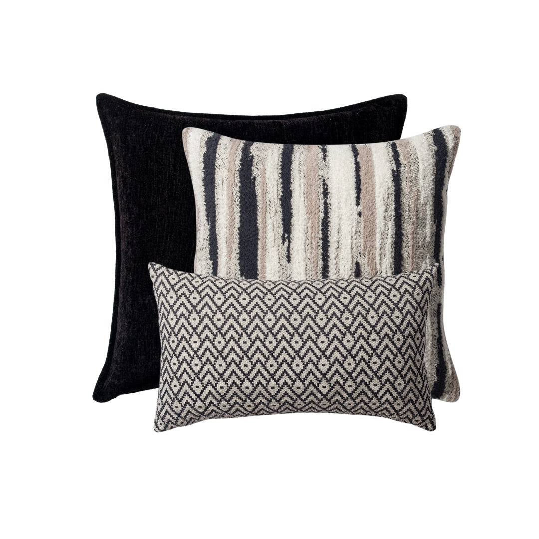 Setin diğer iki parçası olan Alina Siyah Kadife Dokulu Şönil Kırlent ve Gusto Keten Modern Küçük Desenli Kırlent ise farklı dokuları ve desenleriyle kombinasyona zenginlik katıyor.