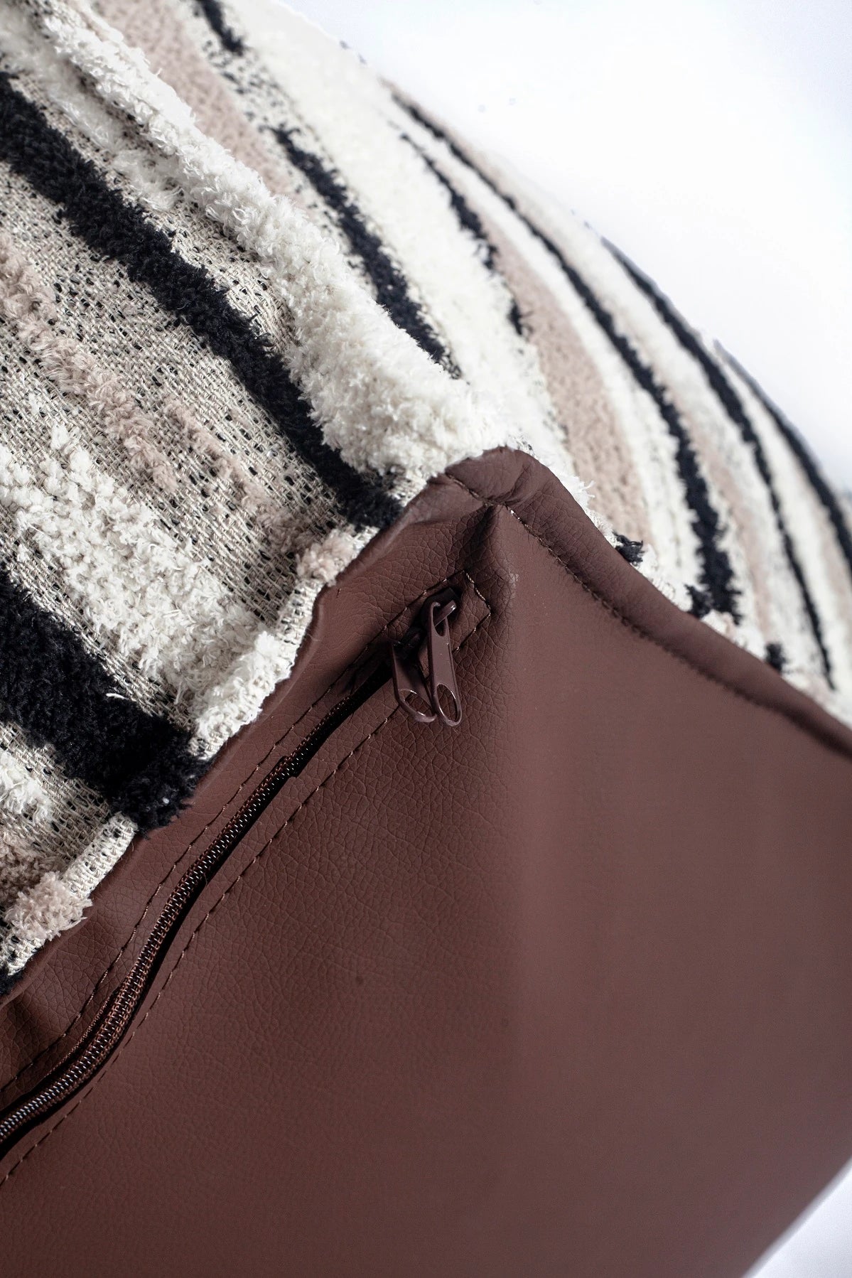 Alpaka Desenli Puf'un tabanında kullanılan deri detay, hem şık bir görünüm hem de kolay temizlik imkanı sunar.