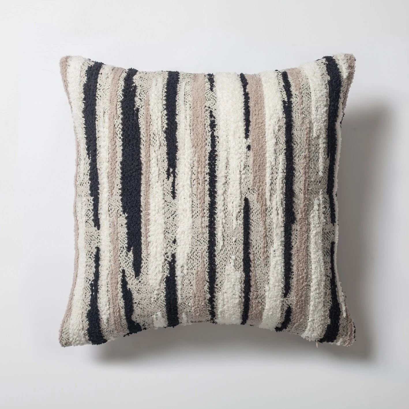 Alpaka Kırlent, siyah, beyaz ve krem renklerin ketenli çizgili dokusuyla el dokuma tarzı peluş tüylü yüzeyi bir araya getirir.
