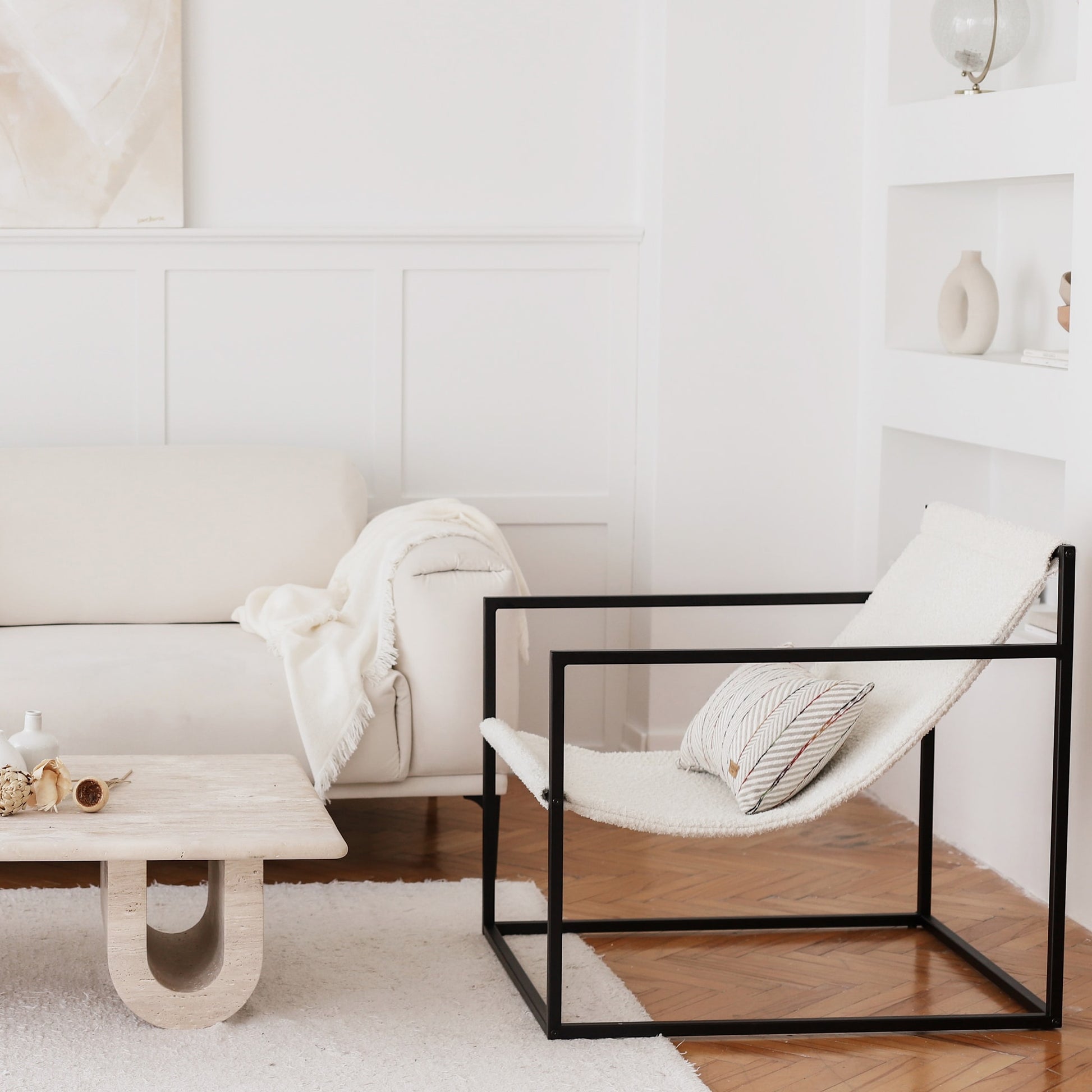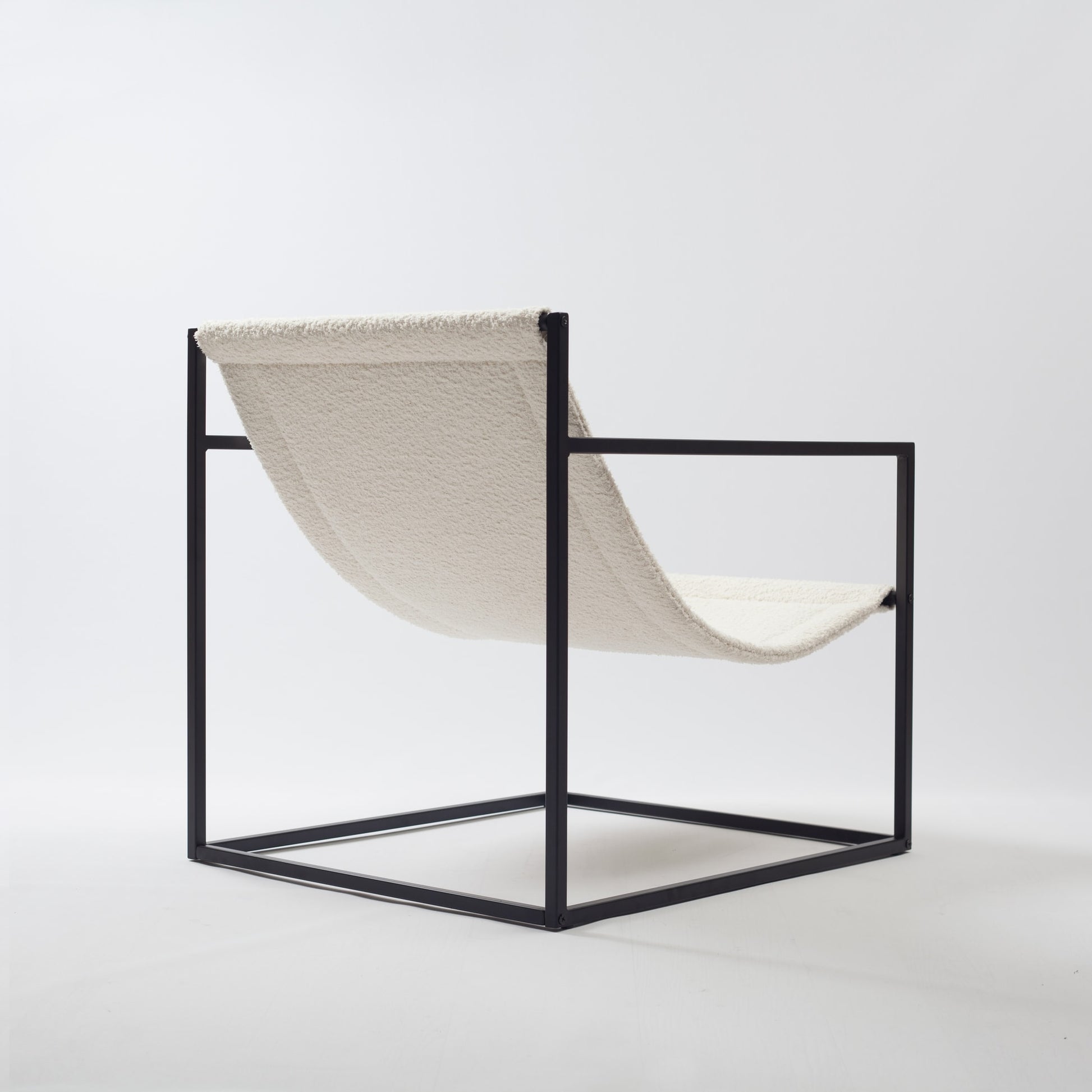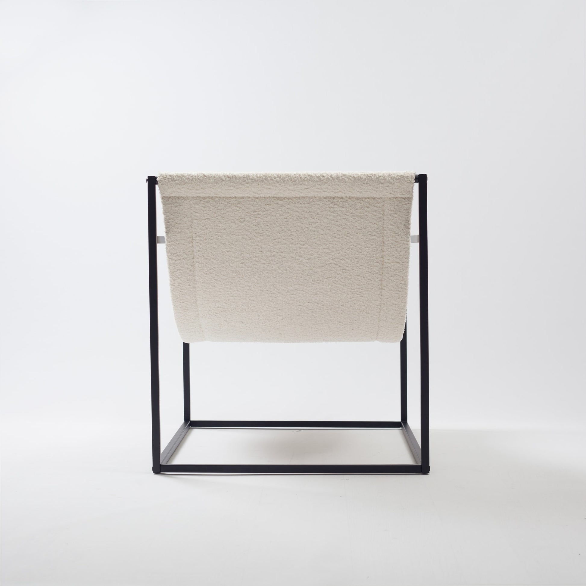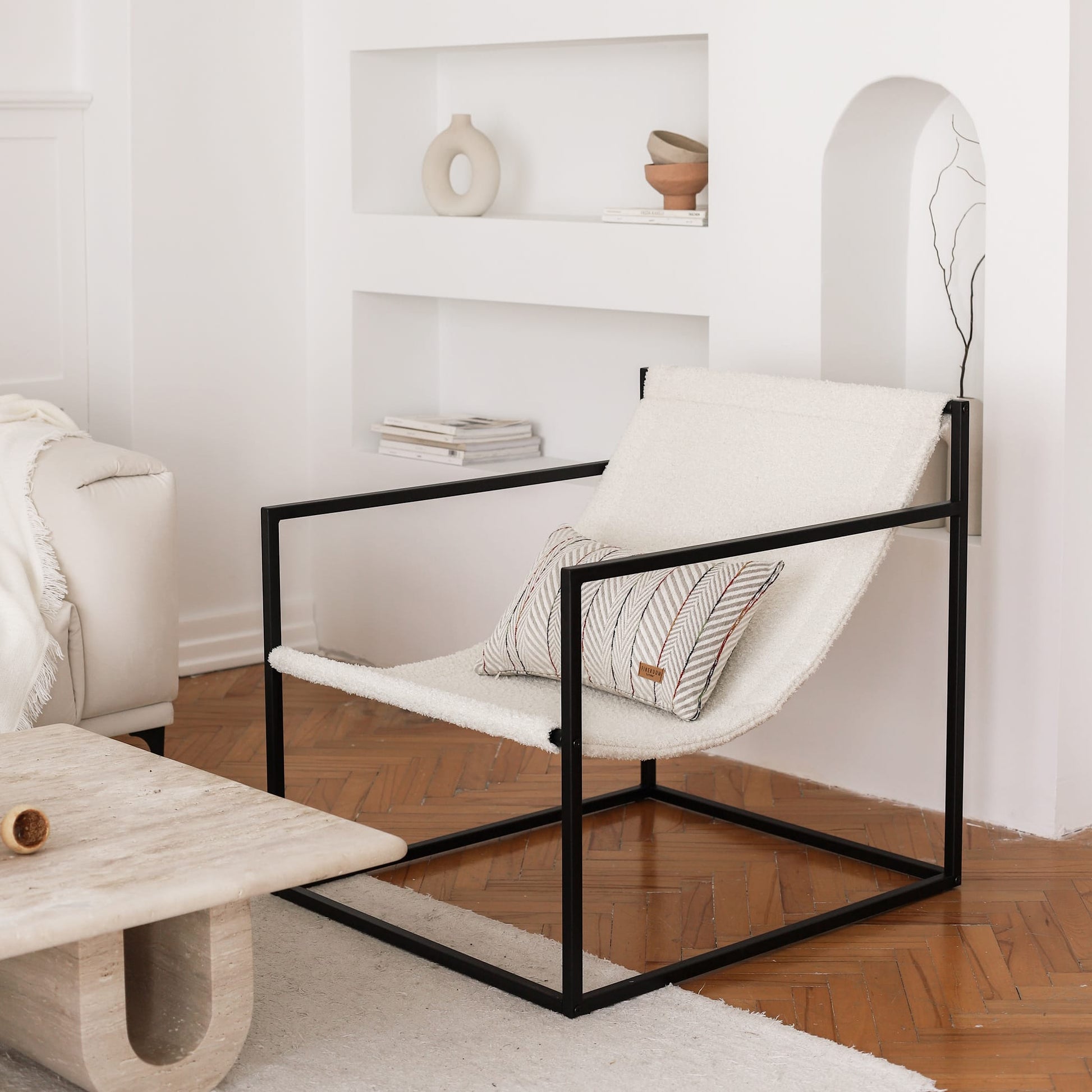 Siyah metal iskeleti, sağlamlığı ve dayanıklılığı temsil ederken, beyaz bukle, buklet ve teddy jakarlı döşemelik kumaşı, koltuğa yumuşak ve davetkar bir hava katıyor.