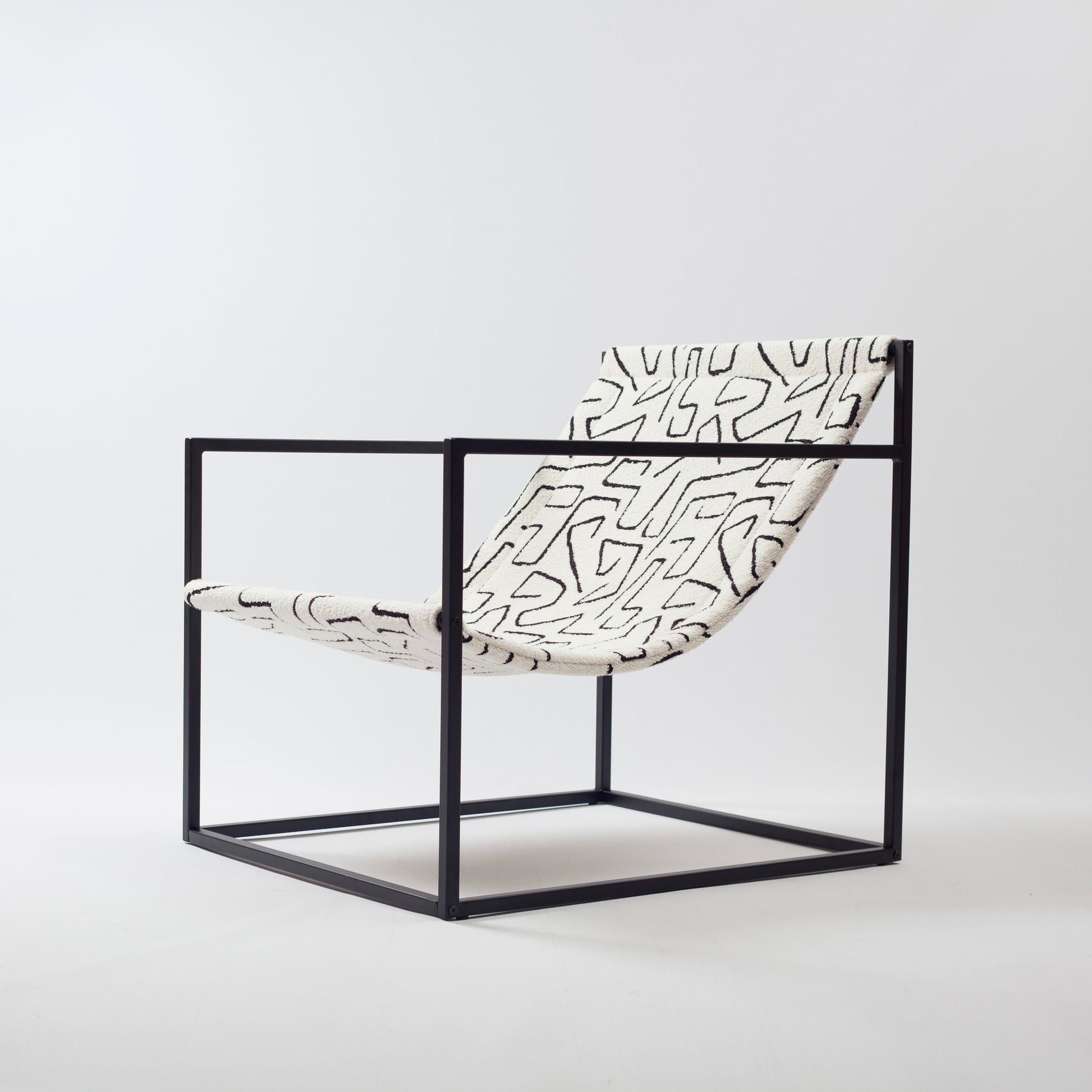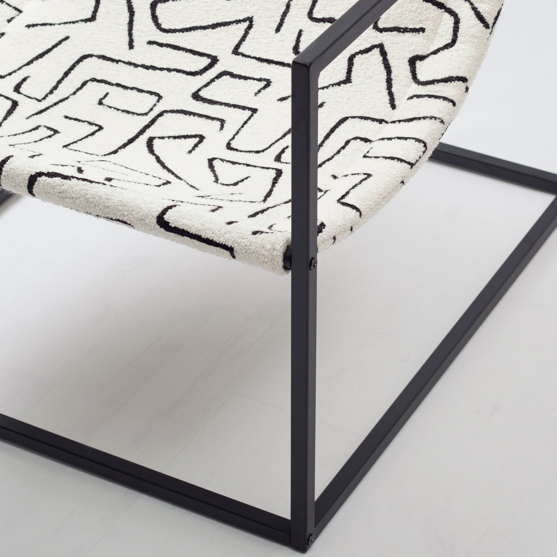 Siyah metal iskeleti, sağlamlığı ve dayanıklılığı temsil ederken, siyah beyaz desenli bukle, buklet ve teddy jakarlı döşemelik kumaşı, koltuğa hem modern hem de sıcak bir hava katıyor.