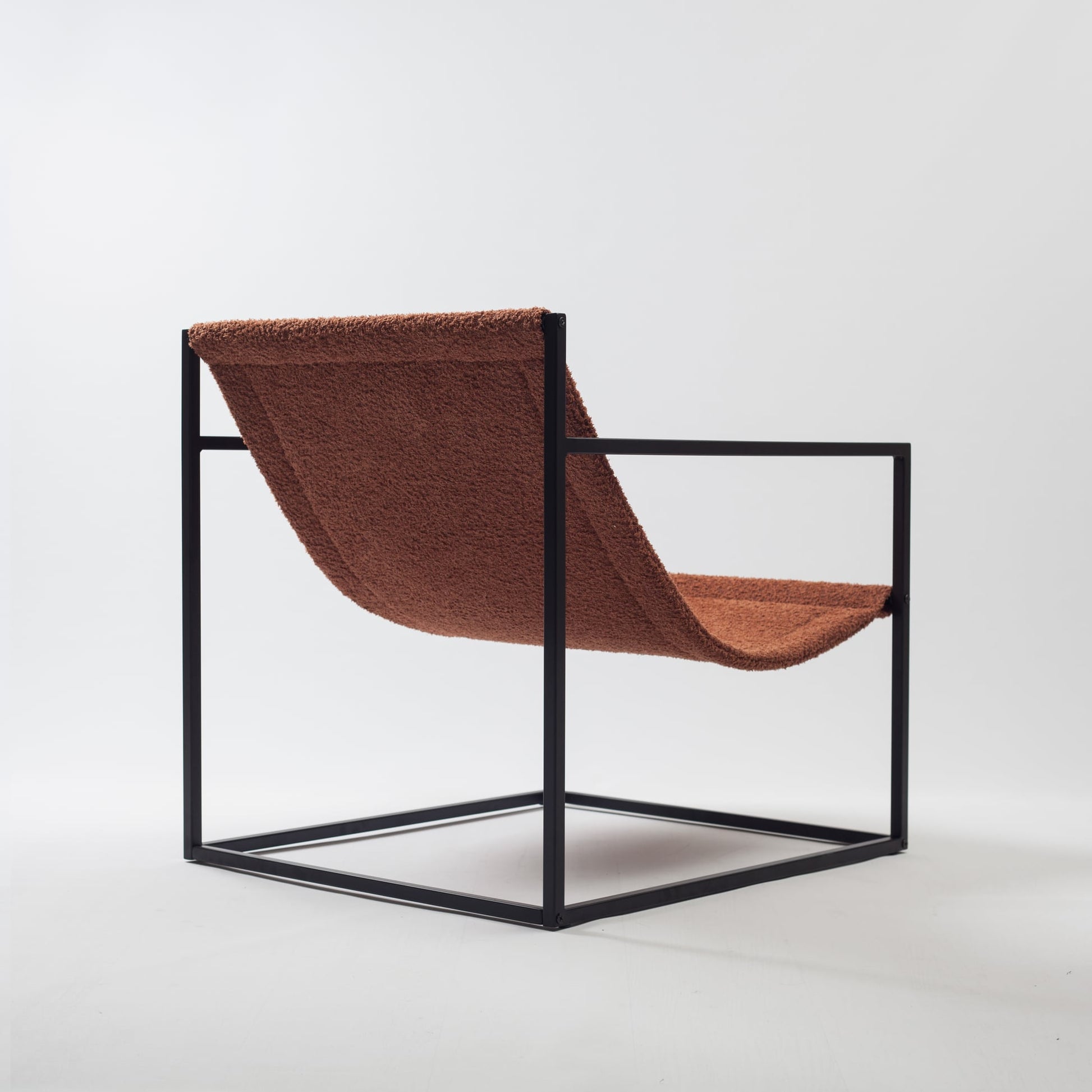 Siyah metal iskeleti, sağlamlığı ve endüstriyel tarzı temsil ederken, kahverengi bukle, buklet ve teddy jakarlı döşemelik kumaşı, koltuğa yumuşak ve davetkar bir hava katıyor.