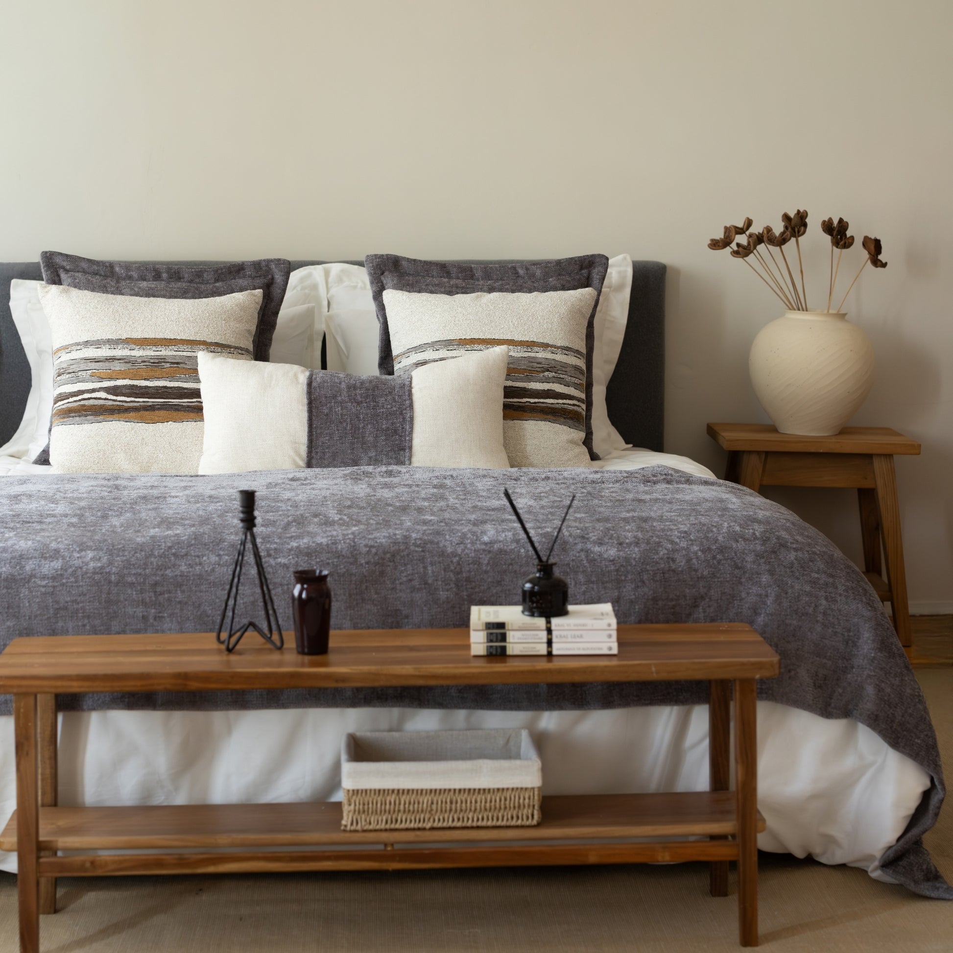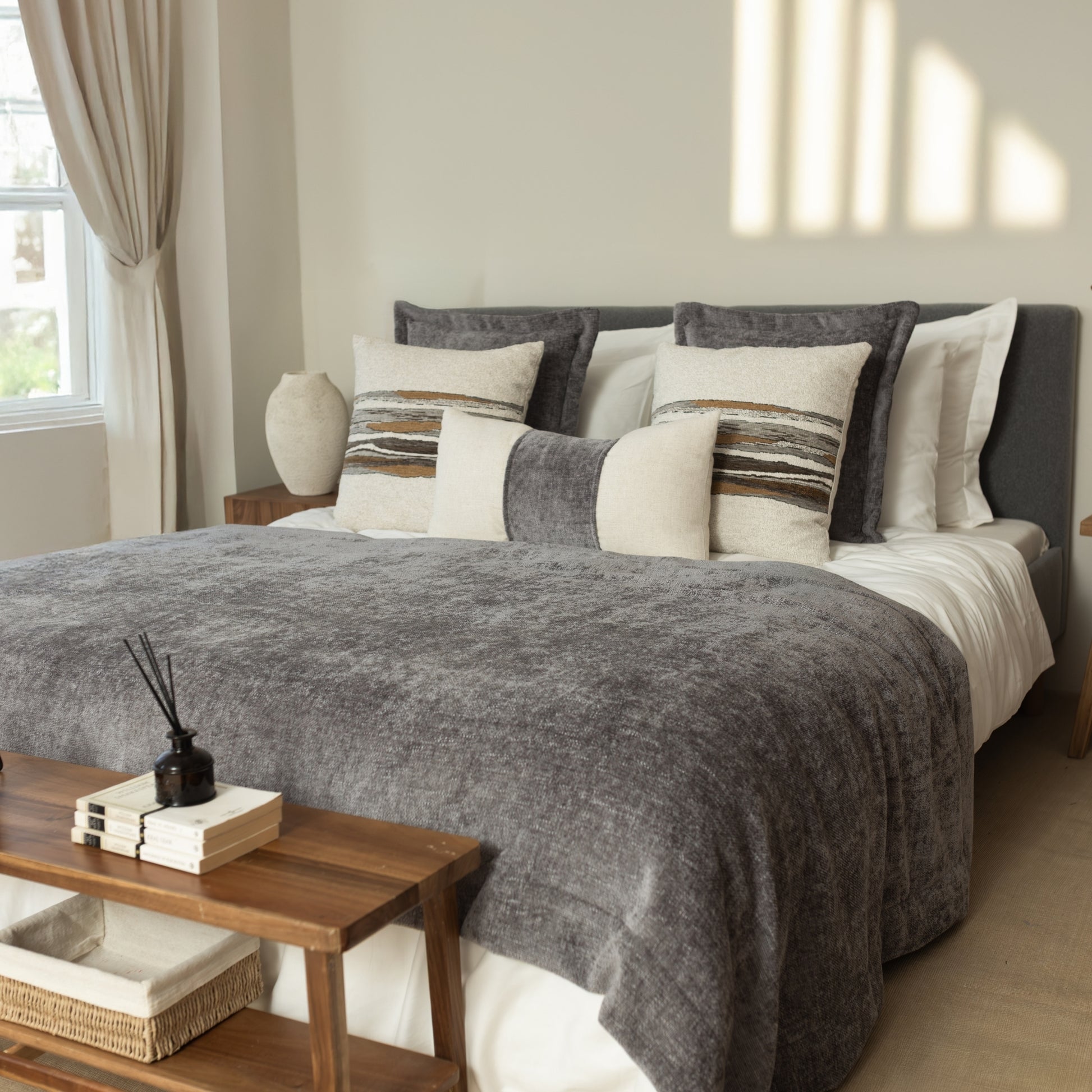 Borla & Combos - 5'li Kırlent ve Geniş Yatak Runner Set - Gri