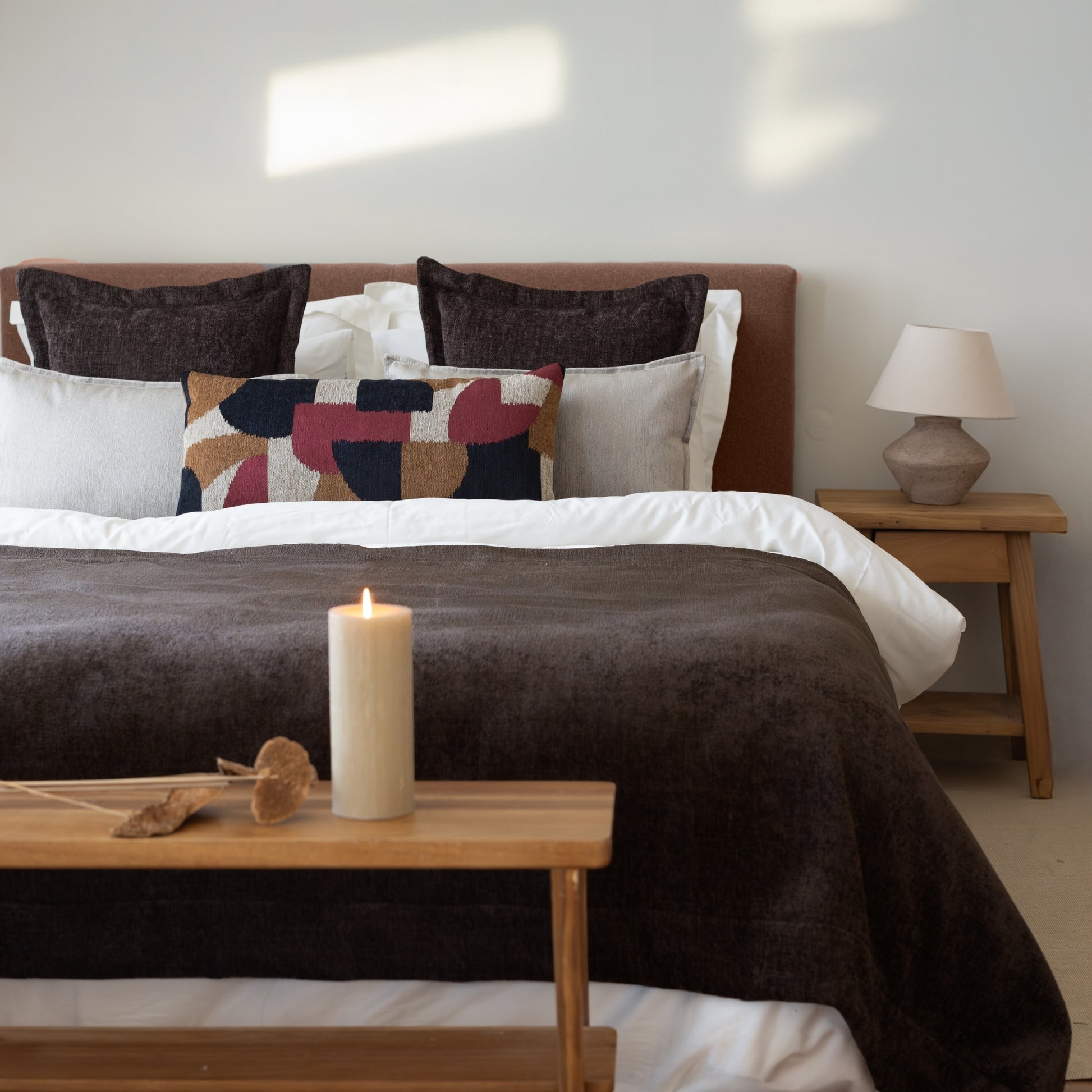 Borla & Otto- 5'li Kırlent ve Geniş Yatak Runner Set - Koyu Kahve