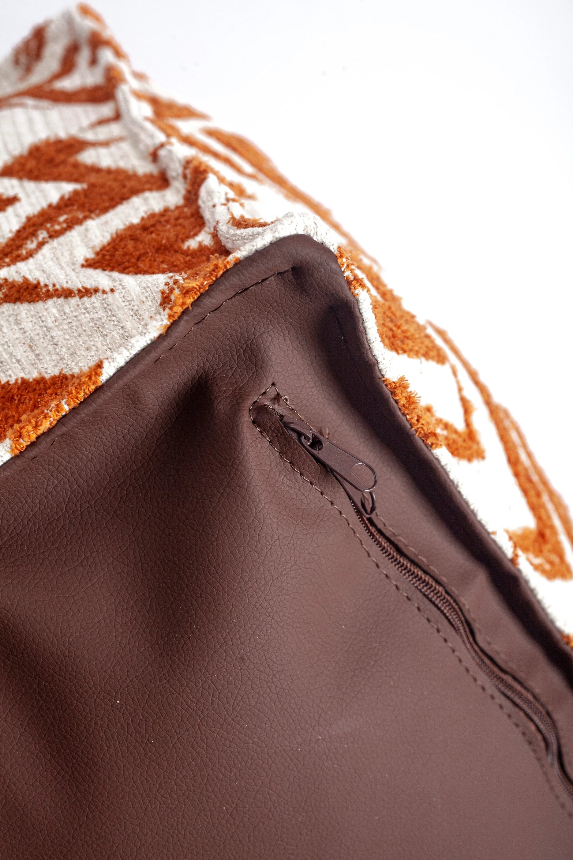 Natural doku üzerindeki turuncu ve beyaz zigzag deseni, pufa modern ve dinamik bir görünüm kazandırırken, aynı zamanda İskandinav stilindeki dekorasyon ve mobilyalarla mükemmel bir uyum yakalıyor.