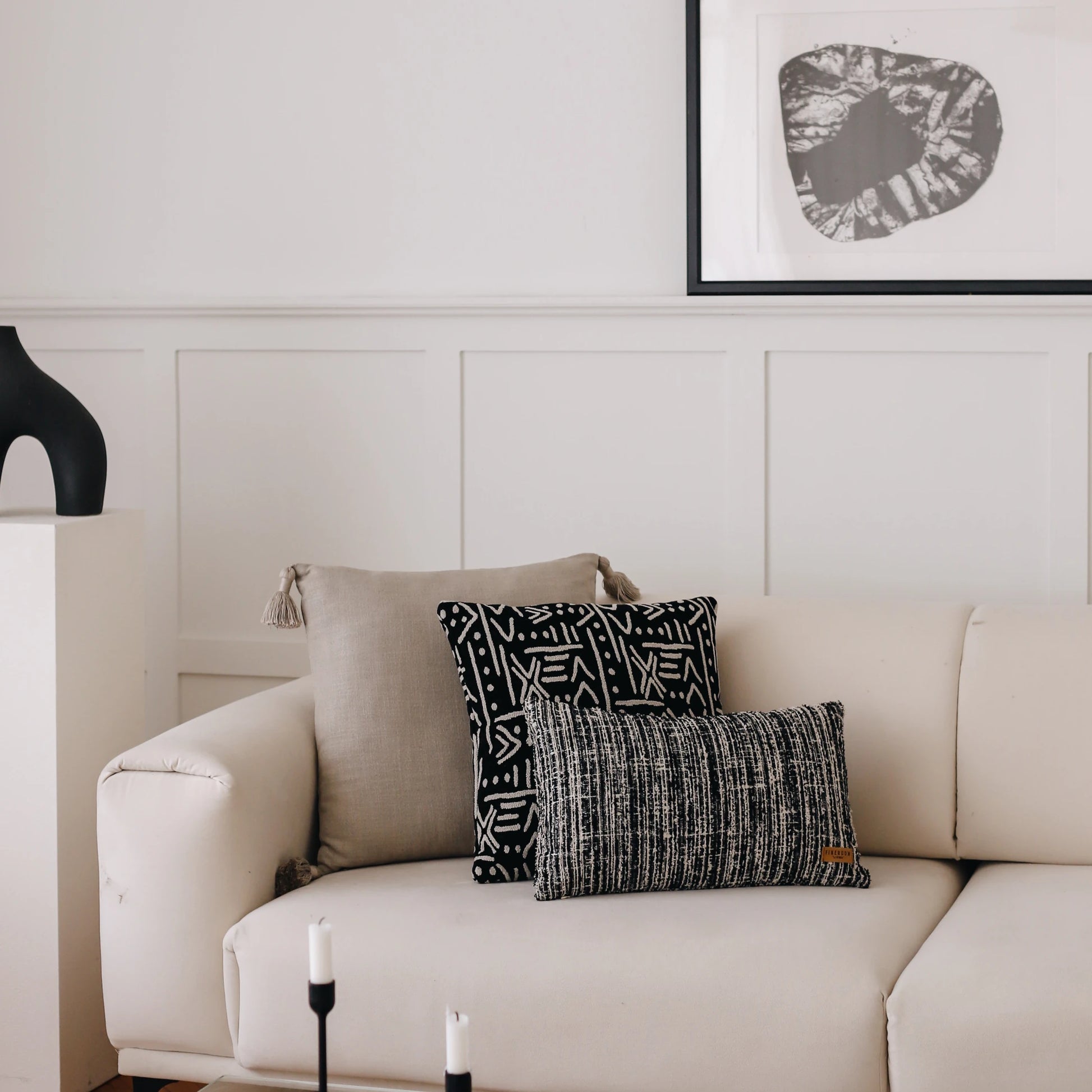 Siyah ve natural tonların kontrastı, İskandinav dekorasyonunuzu tamamlarken, etnik desenler de mekanınıza egzotik bir dokunuş katacak.