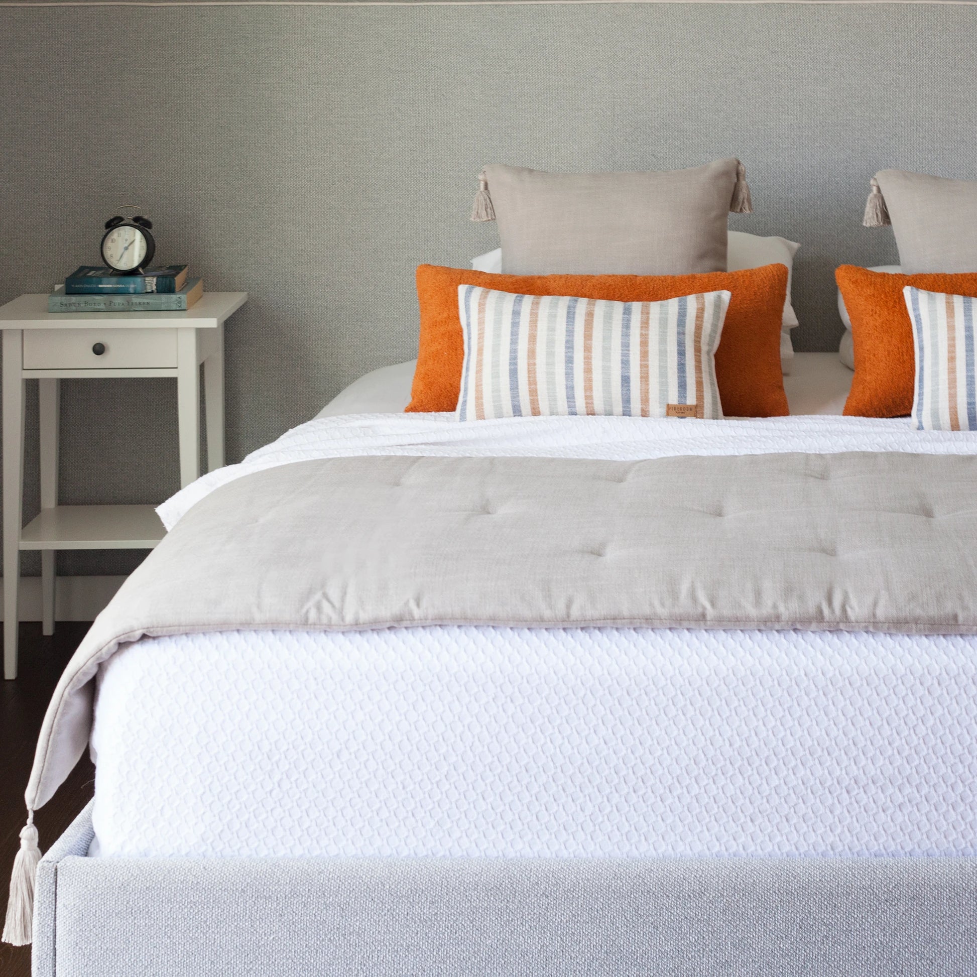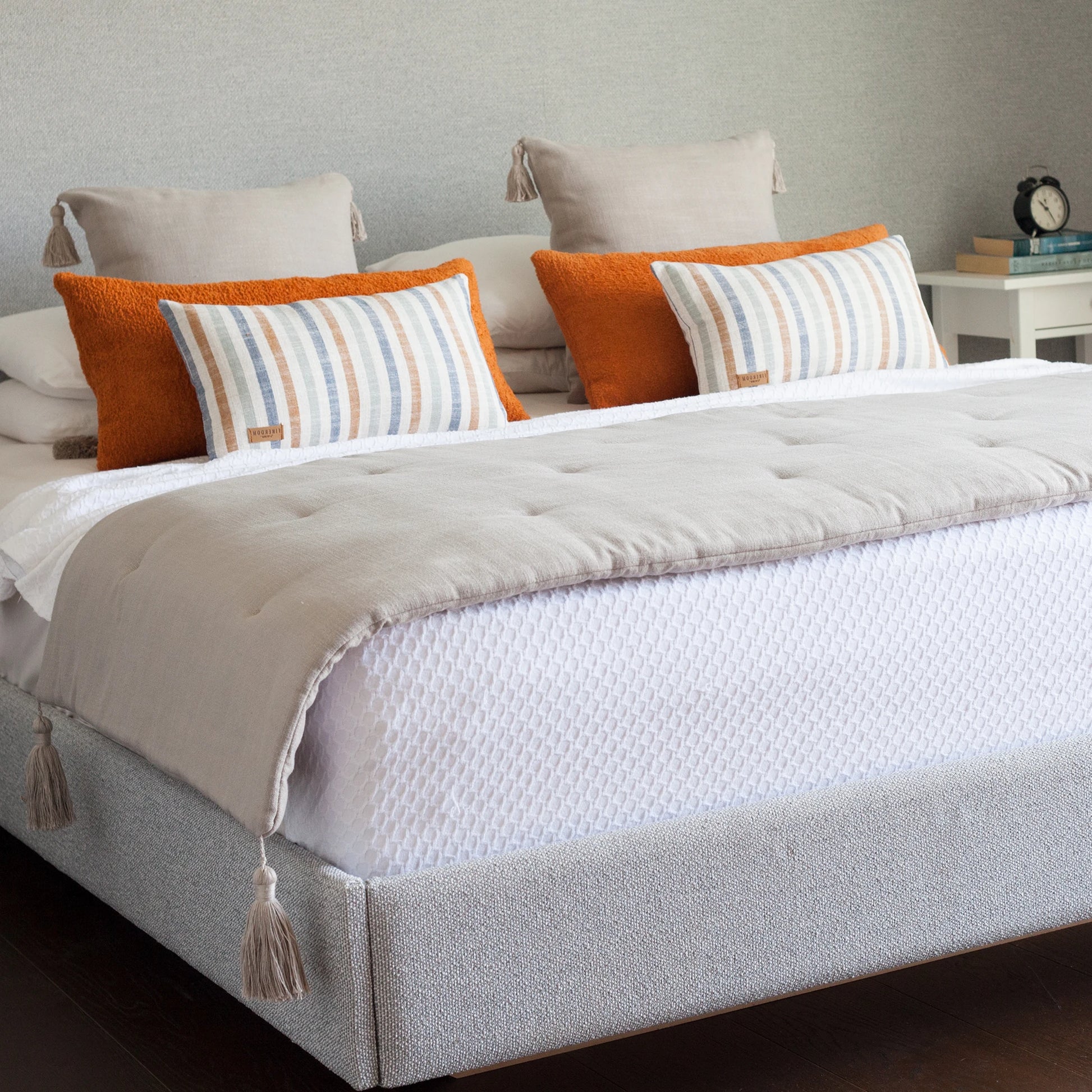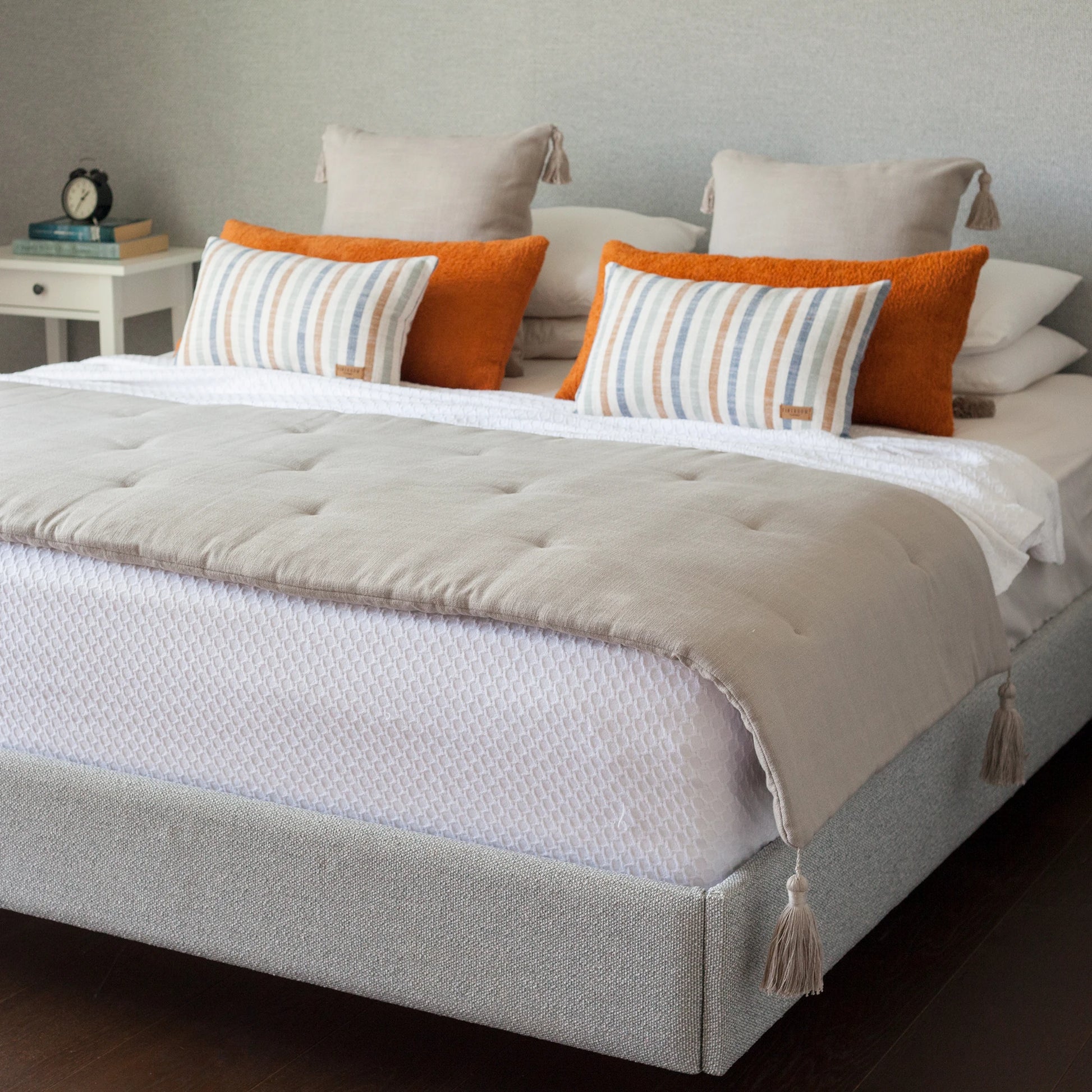 Loom Keten Püsküllü Yatak Runner + 6 Yastıklı Set Cozy Capri, yatak odanıza doğal zarafet ve canlı renklerin enerjisini taşımak için tasarlandı.
