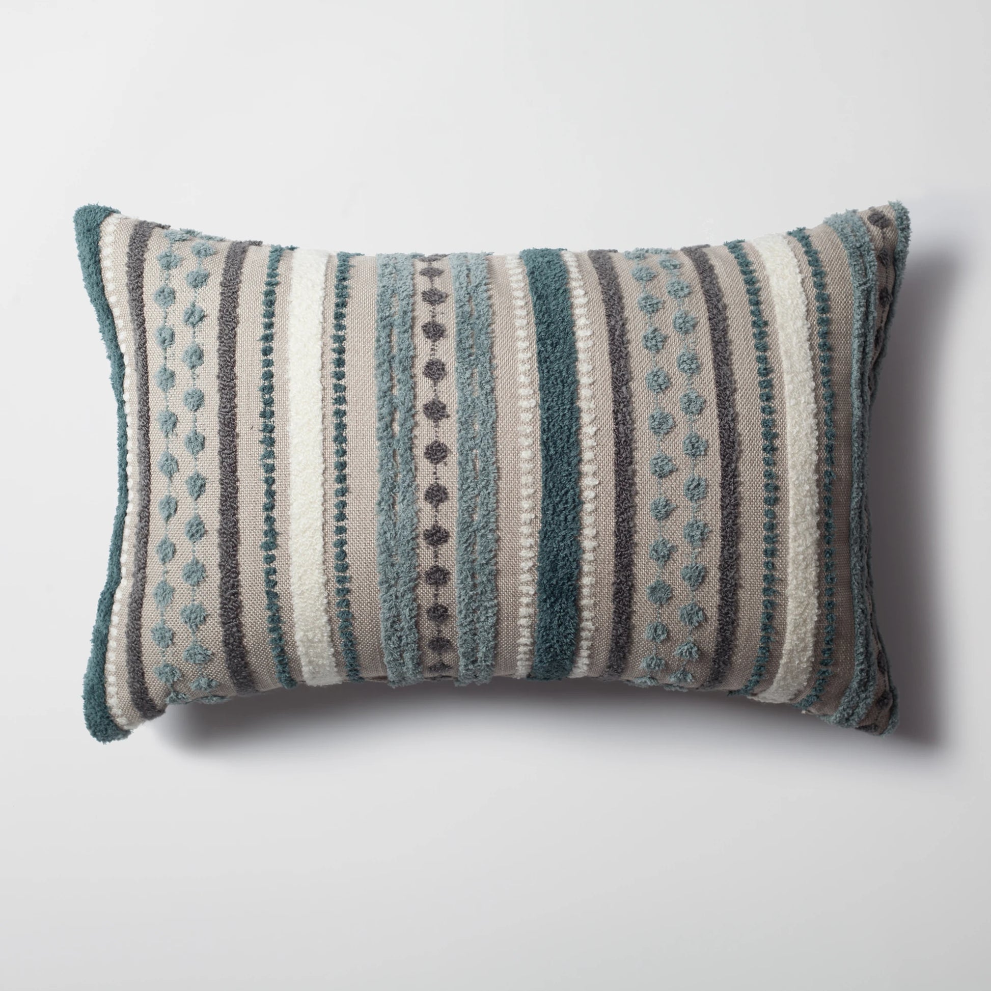 Nomad - Çizgili Çok Renkli Keten Dekoratif Kırlent (40x60), natural doku üzerindeki çizgili deseni ve canlı mavi tonlarıyla dikkat çeker.