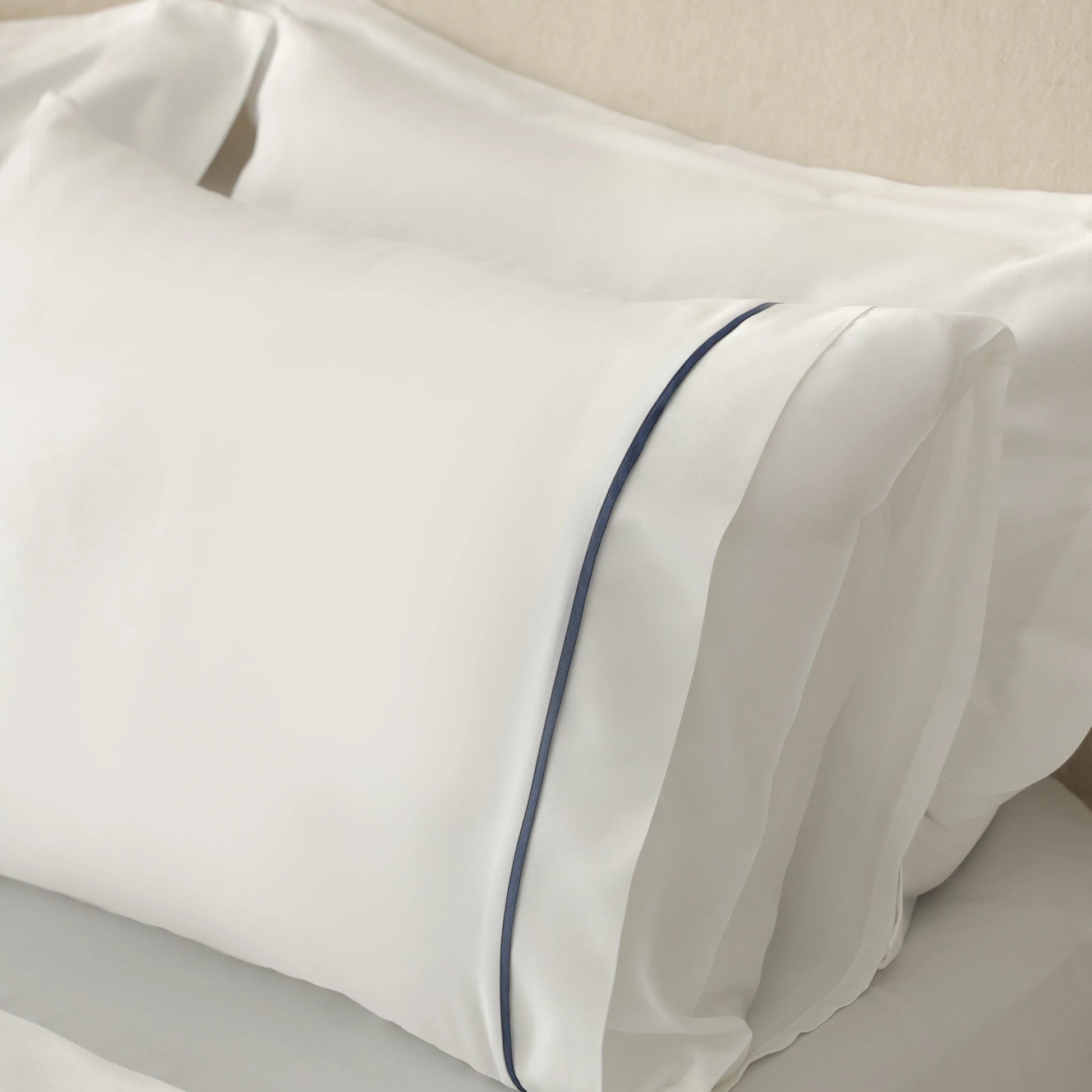 Beyaz zemin üzerine lacivert biyeli detaylarıyla modern ve sofistike bir görünüm kazanan bu tasarım, yatak odanıza zamansız bir zarafet getirir.