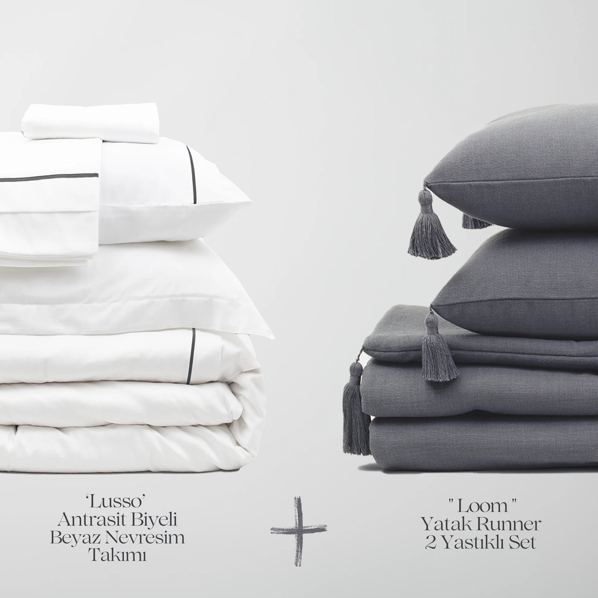 Lusso & Loom Nevresim Takımı + Runner 2 Yastıklı Set - Koyu Gri