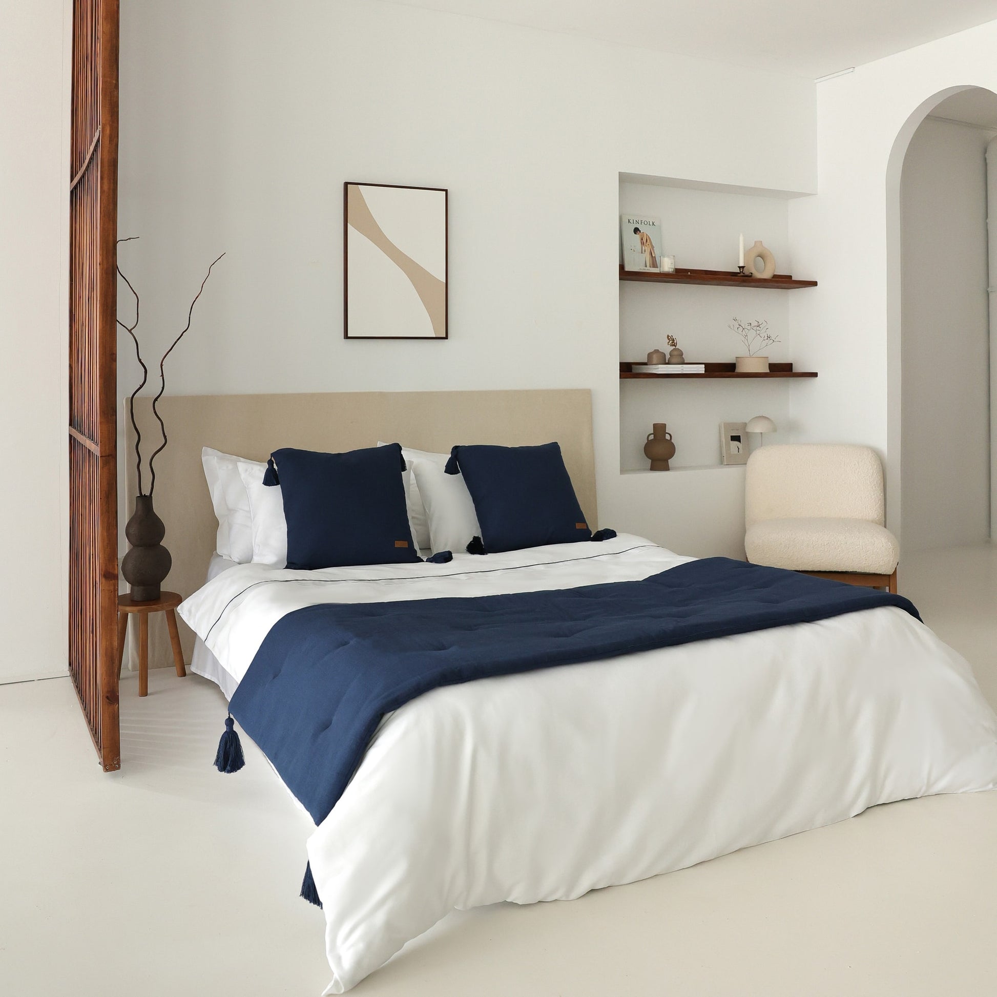 FineRoom Living koleksiyonunun özel parçalarından biri olan Lusso %100 Pamuk Çift Kişilik Lacivert Biyeli Beyaz Nevresim Takımı ile yatak odanızı şıklık ve konforla yeniden şekillendirin.